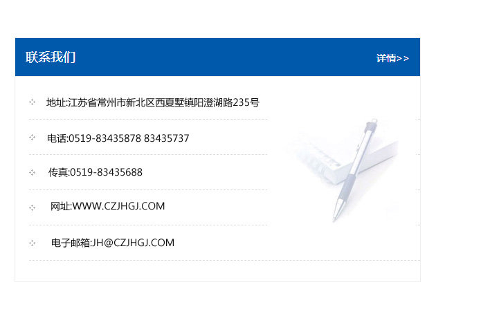 地址:常州市新北區友邦商務大廈1幢16、17層  電話:0519-85101652  傳真:0519-85112595  郵編:213022  網址:www.cz-jiayue_cn.bjjrhs.com  郵箱:xiajifengaa@163.com